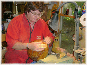 Woodturning has become a passion of the former fine arts sculptor and artist. These days she spends her time in her studio creating unique works of woodturned art from the wonderful species available in the area as well as from exotic hardwoods of special character. Her works include a wide range of ideas from simple bowls to designer art pieces. Most people recognize her for her platters with the carved and metal painted texturing. Rim enhancements are a trademark of the artist. Hollow forms are also one of the many favorite subjects. She has perfected finishing with cyanoacrylate or better known as CA glue and achieves a highly polished and durable finish on larger pieces. This finishing technique has been used widely on smaller objects such as wooden pens for many years but few have been able to master the technique on a larger surface. Peggy is an alum of The Atlanta College of Art (Now SCAD) and was an Honors Student at Georgia State University where she studied to become an Art Educator. Her credits as a sculptor include work on the movie "Freejack" staring Emelio Estavez and Mick Jaggar as well as having been the creator of the Pinwheel Project at Tula in Buckhead. She has received numerous awards of excellence both in fine arts and as a woodturner. Her works are in private and corporate collections throughout the country.